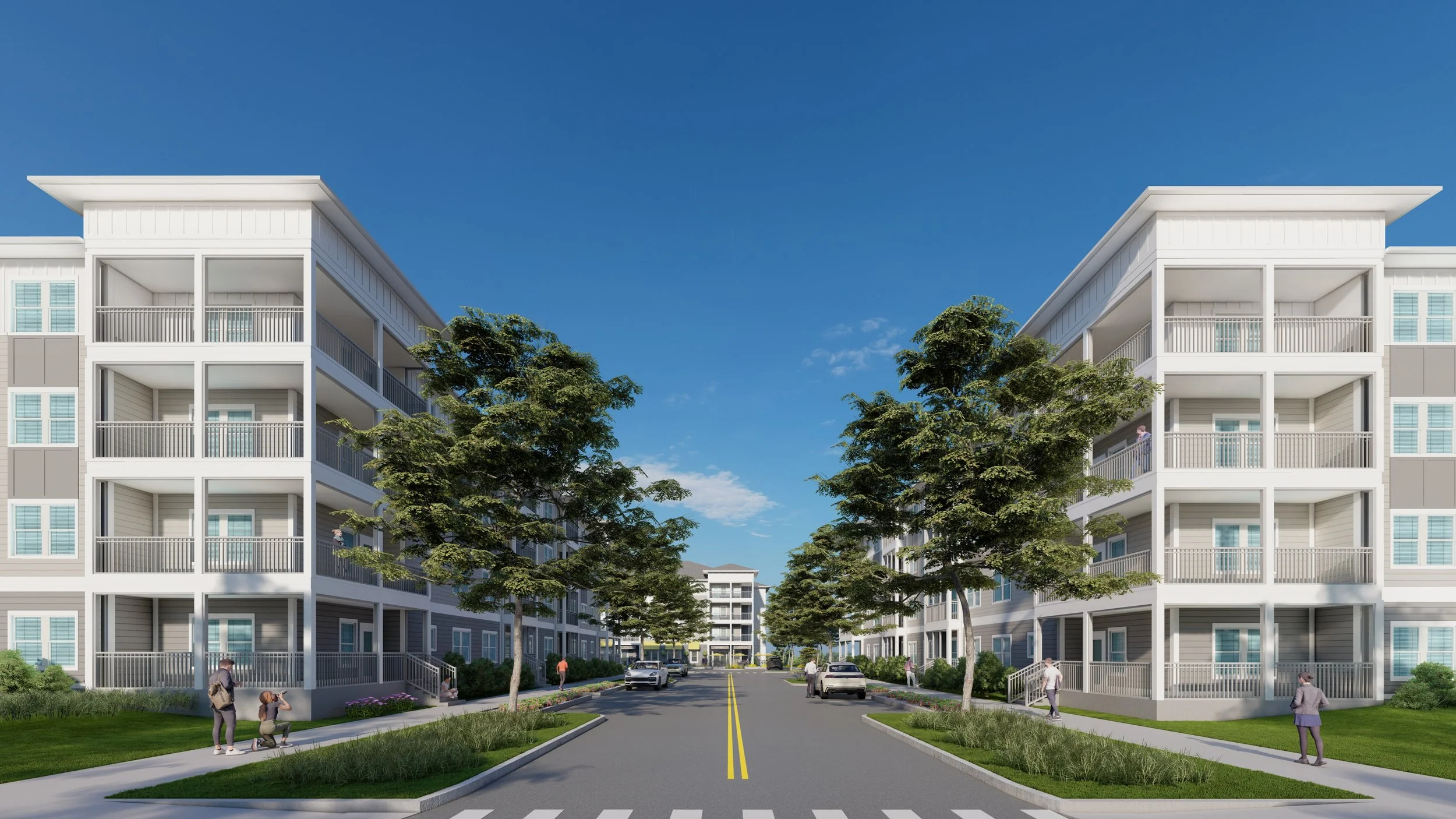 Four of the residential buildings front Timber Road with a center entry drive leading back to the leasing office building that includes tenant amenities such as a club room, a fitness center, and co-work space. These amenity spaces surround the exterior pool deck and gaming areas. Adjacent to the pool are program spaces for grilling and gathering, a bocce ball court, private cabanas, and a fire pit.